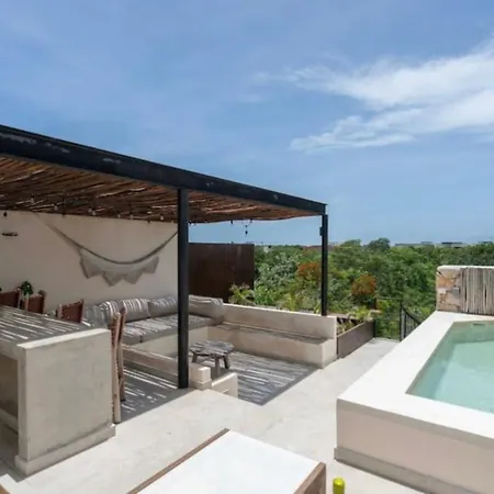 2-slaapkamer Apartamento Vacacional Tulum Quintana Roo Mexico Appartement ligt in het centrum van Tulum Pueblo en verwelkomt gasten met luxe voorzieningen zoals een buitenzwembad. Het appartement van 55 m^2 ligt op ongeveer 2 km van Playa Las Palmas.